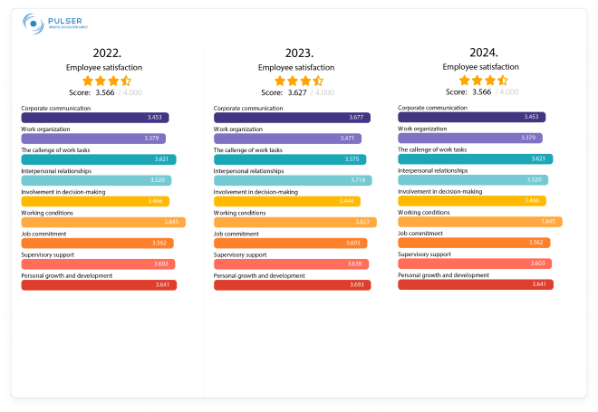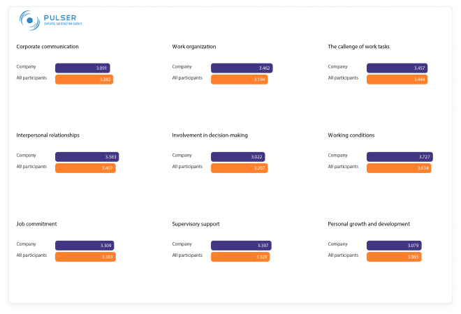 Nakon provedenog istraživanja dobit ćete strukturirane informacije od zaposlenika koje pomažu u pronalaženju odgovora na ključna pitanja koja pridonose poboljšanju upravljanja ljudskim resursima, povećanju angažovanosti te ukupnom zadovoljstvu zaposlenika. Koristeći PULSER platformu, dobit ćete uvid u boostere angažiranosti koji utiču na razinu perfomansa i zadržavanje zaposlenika.